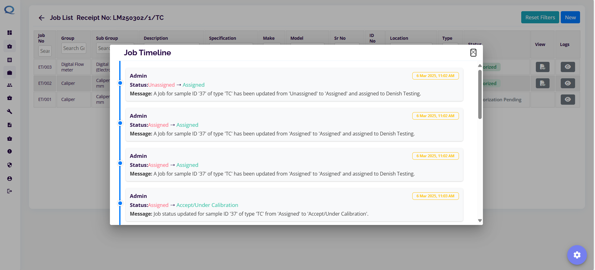 Set a job timeline to track each job, including assigned users, authorization, and certification details for comprehensive oversight.